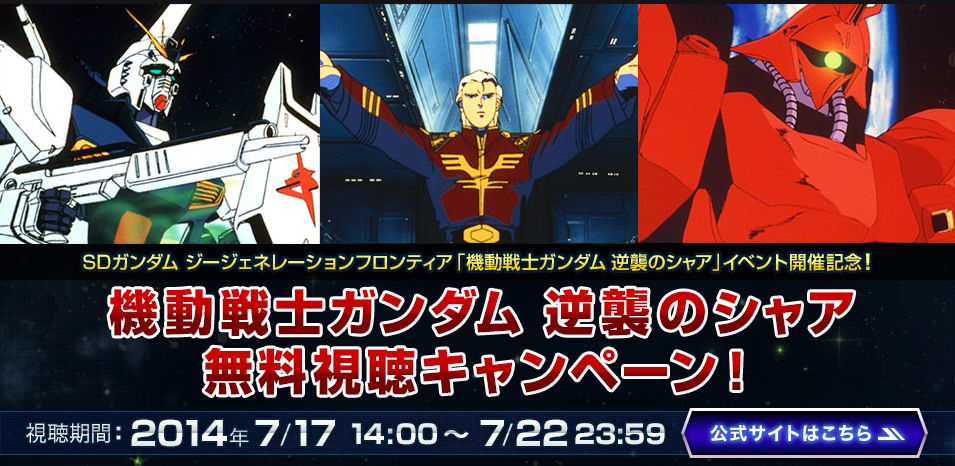 400万ダウンロード突破を記念して「機動戦士ガンダム 逆襲のシャア」をテーマに「緊急クエスト:アクシズ落下阻止作戦」や「スペシャルクエスト 逆襲のシャア」を公開します。さらにガンダムパーフェクトゲームスのジージェネレーション フロンティア特設サイトでは期間限定で劇場版「機動戦士ガンダム 逆襲のシャア」を無料で視聴できるキャンペーンを実施中!この機会にぜひ「SDガンダム ジージェネレーション フロンティア」をお楽しみください。